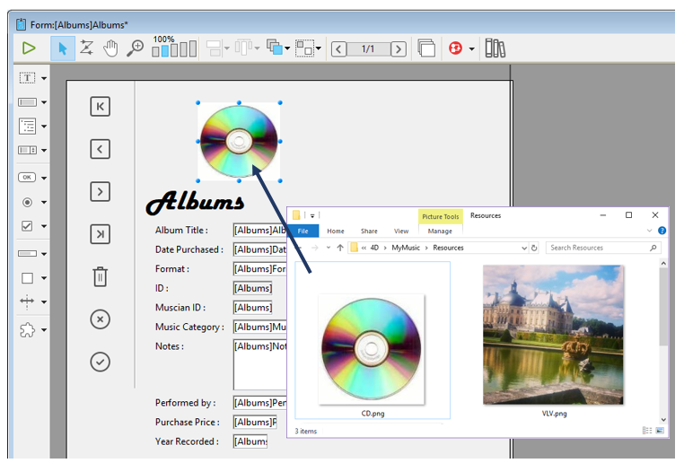 • You can insert a picture reference by dragging and dropping a file stored in the Resources folder of the database (see the “Automatic referencing of picture files” section below).