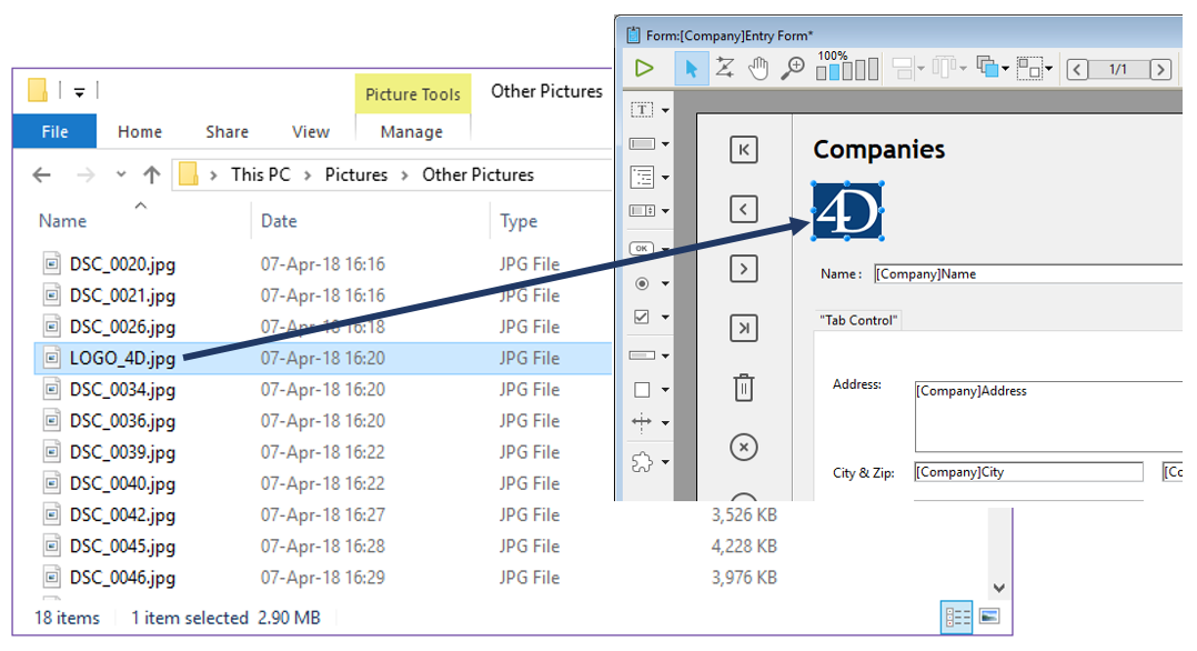- Si suelta la imagen en un objeto dinámico (botón imagen, botón 3D, menú pop-up imagen, etc.), 4D define automáticamente la fuente de imagen "File" e inserta la referencia de la imagen en el formulario de esta forma:“{rutadeacceso+}nomarchivo”.