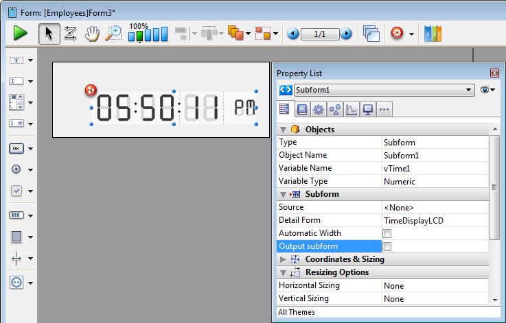 - 式の場合には、式に倍長整数または時間型の値を代入してください。それを0 に設定すると(例: Form.myTime:=0 or Form.myTime:=?00:00:00?)、時計またはLCD は現在時刻を表示します。