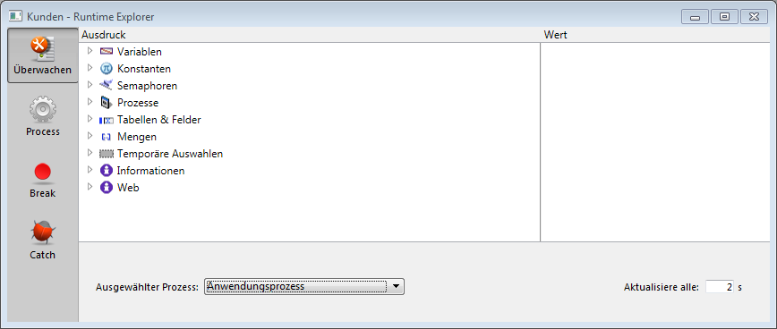 Das Fenster Runtime Explorer hat vier Seiten, die Sie über die Icons am linken Rand öffnen können: Überwachen, Prozess, Break und Catch.