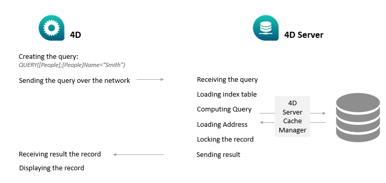 Como 4D Server e 4D falam a mesma língua, não é necessário traduzir as solicitações. A divisão do trabalho entre o cliente e o servidor é transparente e automaticamente é gerenciada pelo 4D Server.