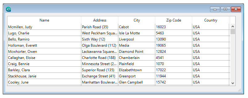 • A nível da interface de usuário: quando 4D mostra uma lista de registros, o formulário utilizado exibe os registros que desempenham um papel na arquitetura cliente/servidor. Por exemplo, a seguinte imagem mostra o resultado de um pedido na tabela [Clientes].