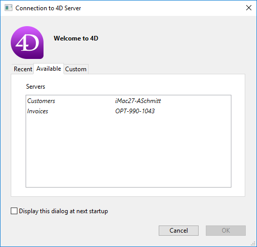 O menu de comando Abrir Bancos Recentes pode ser usado para se conectar automaticamente a um banco de dados 4D Server ao qual você já se conectou previamente.