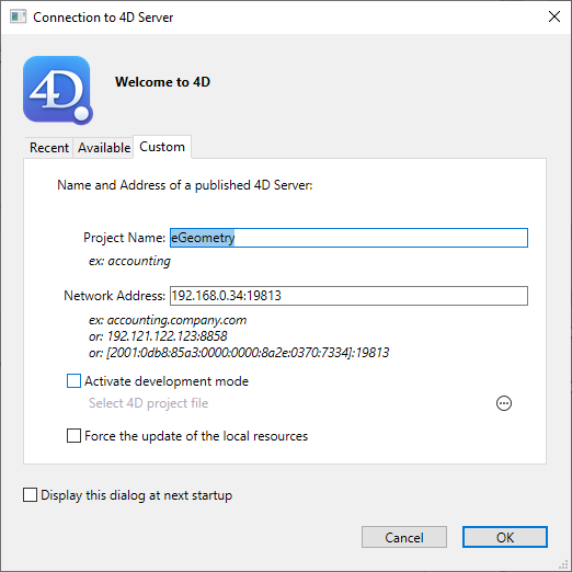 Nota: Você também pode iniciar essa caixa de diálogo ao selecionar o link Conectar ao 4D Server no Assistente de Boas Vindas..