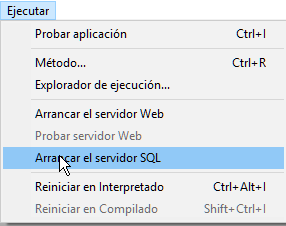 Manualmente, utilizando los comandos Arrancar el servidor SQL en el menú Ejecutar de la aplicación 4D: Nota: con 4D Server, se puede acceder a este comando como botón en la Find in array. Cuando se lanza el servidor, esta opción de menú cambia a Detener el servidor SQL.