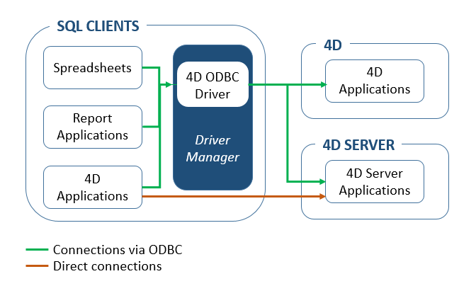 El servidor SQL de 4D permite el acceso externo a los datos almacenados en la base 4D. Para las aplicaciones de terceras partes y las aplicaciones 4D, este acceso se realiza mediante un driver ODBC 4D. También es posible realizar conexiones directas entre una aplicación cliente 4D y 4D Server. Todas las conexiones se hacen usando el protocolo TCP/IP.