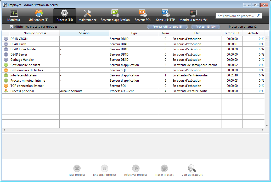 Vous pouvez filtrer la liste des process affichés à l'aide des boutons Process utilisateurs, Process 4D, Process en attente et de la zone de filtre situés en haut à droite de la fenêtre d'administration.