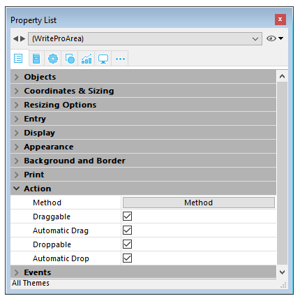 ご自分の4D Write Proエリアでのドラッグ&ドロップ機能の設定をするためには、プロパティリストの"アクション"テーマ内にて適切なオプションを選択する必要があります: