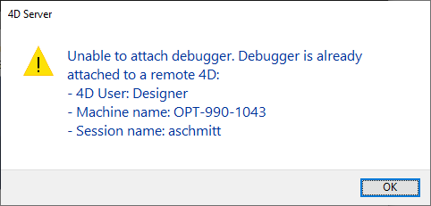 Embora o depurador já esteja conectado a um servidor 4D remoto ou a um servidor 4D (padrão), nenhuma outra máquina pode anexar o depurador.