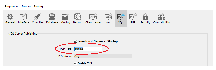 • Server: definido para utilizar el 4D Server en la máquina con la dirección IP= "187.145.45.23"; no se especifica ningún puerto, se utilizará el puerto por defecto (19812).