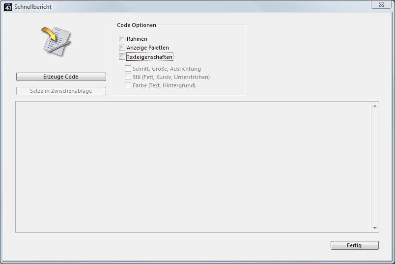 • Texteigenschaften: Damit geben Sie an, dass die für den Bericht definierten Schrifteigenschaften in den 4D Code integriert werden sollen. Ist diese Option nicht markiert, bleiben die drei darunterliegenden Optionen ohne Wirkung.