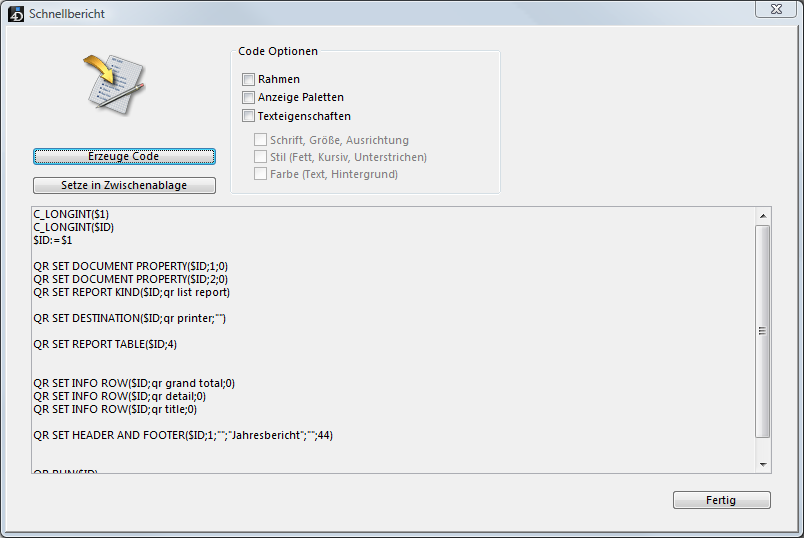 Im Schnellberichteditor lässt sich automatisch 4D Code generieren, der zu einem bestimmten Bericht gehört und in die Zwischenablage kopiert werden kann. Auf diese Weise können Sie manuell erstellte Vorgaben für Schnellberichte über die 4D Programmiersprache an Ihre Bedürfnisse anpassen (Befehle im Kapitel Schnellbericht der 4D Programmiersprache). Diese Funktionalität ist nur im Designmodus verfügbar.