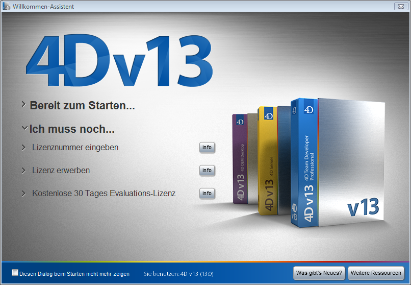 Wenn Sie Ihre 4D Version nach den Anweisungen im Installationshandbuch installiert und registriert haben, können Sie das Programm starten.