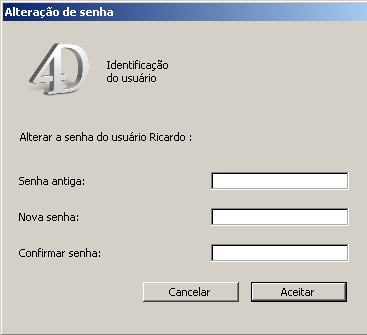 A caixa de diálogo de identificação do usuário padrão inclui um botão Alterar. Este botão permite ao usuário atual modificar sua própria senha. Se for exibido na lista de usuários, o usuário atual é o usuário selecionado. Se não e mostrado na lista, o nome do usuário atual deve ser introduzido de antemão na caixa de diálogo de identificação do usuário: