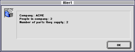 ALERT("Company: "+[Companies]Name+Char(13)+"People in company: "+String(Records in selection([People]))+Char(13)+"Number of parts they supply:"+String(Records in selection([Parts])))Sie erhalten folgende Warnung: