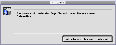 ALERT("Sie haben nicht mehr das Zugriffsrecht zum Löschen dieser Datensätze.";"Ich schwöre, das wußte ich nicht")zeigt folgende Meldung auf dem Bildschirm: