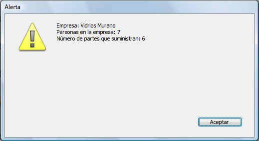 Este ejemplo muestra una caja de diálogo de alerta que muestra información sobre una empresa. Note que el mensaje contiene retornos de carro, que hacen que el texto pase a la línea siguiente: