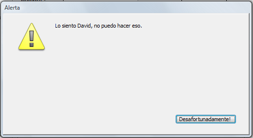 ALERT("Lo siento David, no puedo hacer eso";"Desafortunadamente!")Muestra la siguiente caja de diálogo de alerta (en Windows):