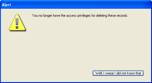 ALERT("You no longer have the access privileges for deleting these records.";"Well, I swear I did not know that")以下のようなアラートダイアログボックスを表示します: