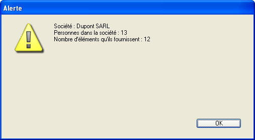 d'éléments qu'ils fournissent"+Chaine (Enregistrements trouves([Eléments])))Voici la boîte de dialogue d'alerte affichée (sous Windows) par notre exemple :