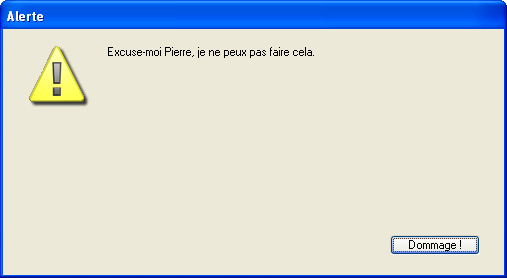 ALERTE("Excuse-moi Pierre, je ne peux pas faire cela.";"Dommage !")Cette instruction affichera (sous Windows) la boîte de dialogue d'alerte suivante :