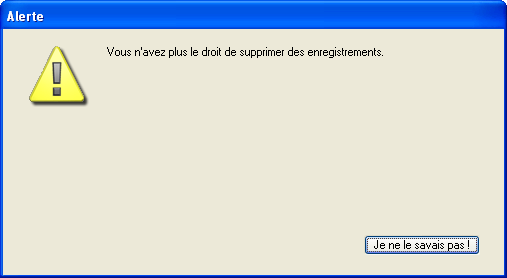 ALERTE("Vous n'avez plus le droit de supprimer des enregistrements.";"Je ne le savais pas !")Ce code affiche la boîte de dialogue d'alerte suivante :