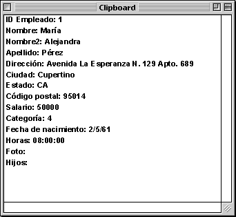Utilizando los comandos del tema portapapeles y de los BLOBs, puede construir esquemas sofisticados de Cortar/Copiar/Pegar para administrar datos estructurados en lugar de una sola pieza de información. En el siguiente ejemplo, los dos métodos de proyecto SET RECORD TO CLIPBOARD y GET RECORD FROM CLIPBOARD le permiten tratar un registro de una información a copiar en o desde el portapapeles.