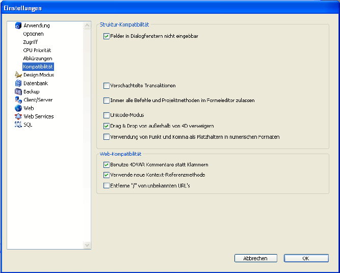Hinweis zur Kompatibilität: 4D kann mit zwei Zeichensätzen arbeiten: Unicode oder ASCII. Ab Version 11 von 4D wird für neue Anwendungen standardmäßig der Unicode Modus verwendet. Der ASCII Modus wird aus Kompatibilitätsgründen für Anwendungen, die mit einer älteren 4D Version erstellt wurden, beibehalten. Dieser Modus heißt ASCII Kompatibilitätsmodus.