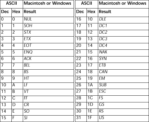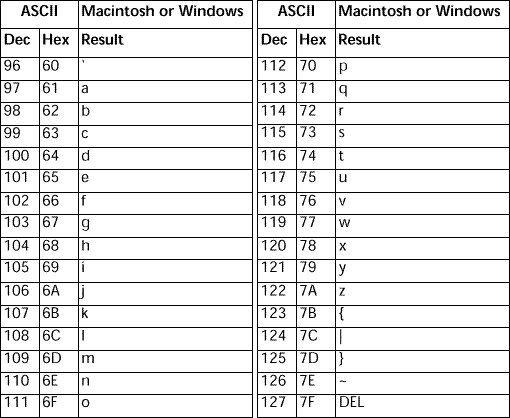 • Der genormte ASCII-Satz reicht von 0 bis 127 und gilt für Windows und Macintosh gleichermaßen.
