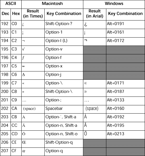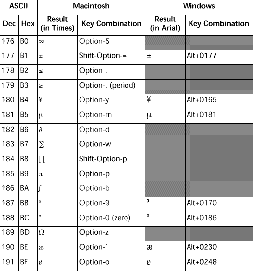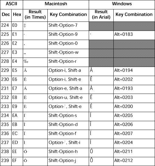 Note: 灰色で塗りつぶされたボックスは、Windowsで使用できない文字か、Macintoshと異なる文字を示しています。