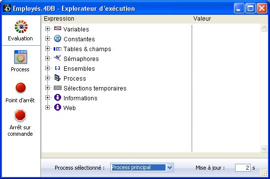 La fenêtre se compose de quatre pages, accessibles via des boutons situés dans la partie gauche : Evaluation, Process, Points d’arrêt et Arrêt sur commande.