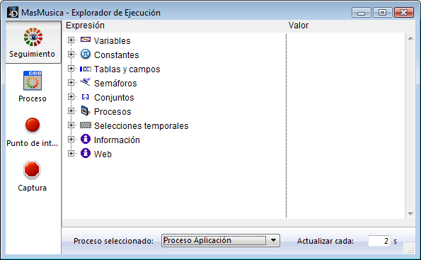 La ventana del Explorador de ejecución tiene cuatro páginas, accesibles vía los botones ubicados a la izquierda: Seguimiento, Proceso, Punto de interrupción y Captura.
