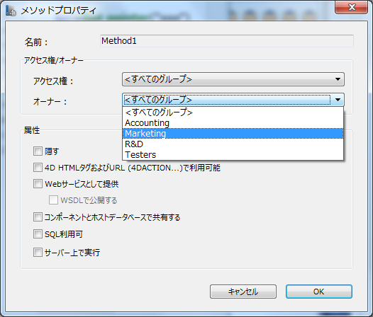 次の図は、あるプロジェクトメソッドにオーナーアクセス権を割り当てている様子を表わしています。グループにはアクセス権 (利用権限) やオーナー (更新権限) を割り当てることができます。