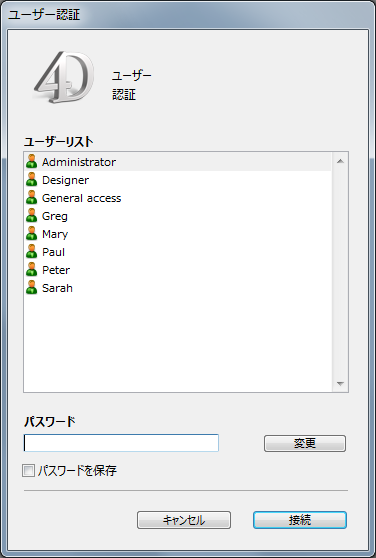 データベース設定でユーザーは自分のパスワードを変更可能オプションが選択されている場合、パスワード入力ダイアログに変更ボタンが表示されます。このボタンをクリックして、リスト中で選択されているユーザーのパスワードを変更できます。