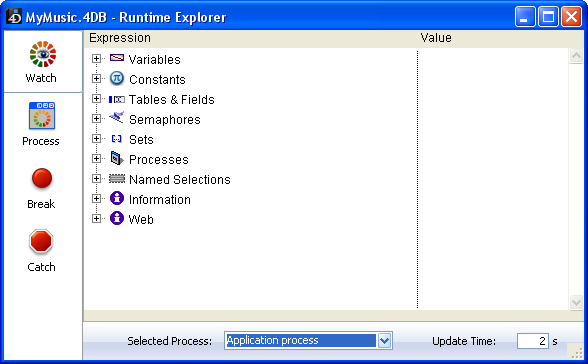 The Runtime Explorer window has four pages that are accessed via buttons on the left-hand side: Watch, Process, Break, and Catch.