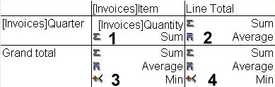 You can add summary calculations on the contents of fields and formulas to each Subtotal row and to the Totals row. In a cross-table report, calculations can be inserted in the center row.