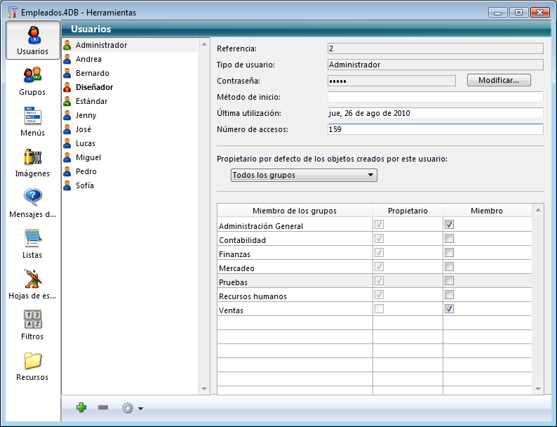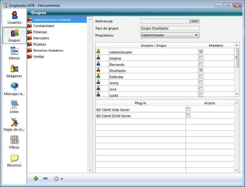 4D muestra la ventana de edición de grupos: