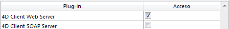 Igualmente puede restringir el uso del servidor web 4D Client y del servidor SOAP vía el área de acceso a los plug-ins.
