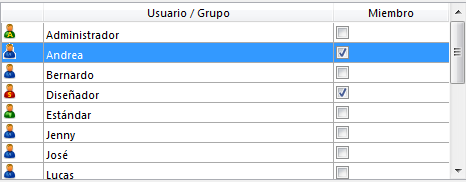 • La columna Propietario indica si el usuario seleccionado es propietario del grupo. Esta columna no puede modificarse.