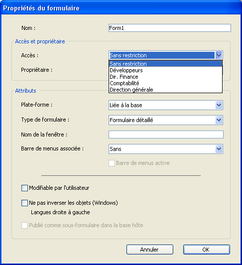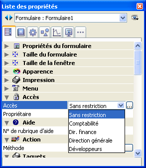 La Liste des propriétés et la fenêtre “Propriétés du formulaire” comportent les listes Accès et Propriétaire :