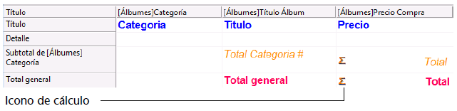 Puede añadir cálculos efectuados a partir del contenido de campos y fórmulas a cada línea de subtotal y de total general. En un informe tabla cruzada, los cálculos se deben insertar en la línea central.