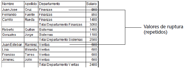 En un informe con subtotales, las columnas utilizadas para agrupar los registros sobre los cuales se efectúan los cálculos, se llaman columnas de rupturas. En el informe que se muestra a continuación, el campo Departamento es una columna de ruptura, ya que los registros en el informe se agrupan por departamento.