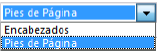 La caja de diálogo Encabezado y pie de página le permite especificar encabezados y pies de página en una misma pantalla. Utilice el menú desplegable Encabezados/Pies de página para definir el área que quiere modificar. - Seleccione Encabezados o Pies de página en el menú de selección: