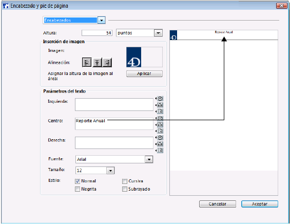 A medida que introduce la altura del encabezado y pie de página, las líneas en el área de previsualización de la página se desplazan para indicar el tamaño del encabezado y del pie de página al imprimir el informe. - Si quiere utilizar una imagen, péguela en el área de imagen (utilice los comandos estándar copiar y pegar):