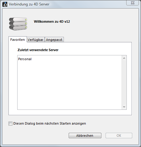 Hinweis: Sie können dieses Dialogfenster auch öffnen, wenn Sie im 4D Willkommen-Assistent auf den Link Anmelden an 4D Server klicken.
