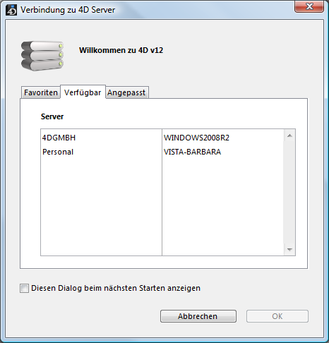 4D Server enthält ein integriertes TCP/IP System, das standardmäßig die Namen der 4D Server Datenbanken veröffentlicht, die über das Netzwerk verfügbar sind. Die Namen erscheinen im Anmeldedialog auf der Seite Verfügbar.