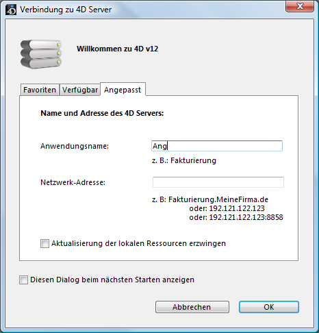 Netzwerk-Adresse: Hier geben Sie die IP-Adresse des Rechners an, auf dem der 4D Server gestartet wurde. Laufen auf einem Rechner zwei Server gleichzeitig, müssen an die IP Adresse ein Doppelpunkt und eine Port-Nummer angehängt werden, zum Beispiel 192.168.92.104:19814. Der Port zum Veröffentlichen eines Servers ist standardmäßig 19813. Diese Nummer lässt sich in den Einstellungen der Anwendung verändern. Weitere Informationen dazu finden Sie im 4D Server Handbuch im Abschnitt Einstellungen zur Konfiguration.