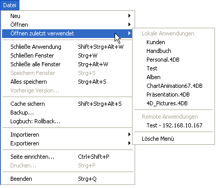 Über das Menü Datei/Ablage>Öffnen zuletzt verwendet können Sie sich direkt an eine 4D Server Datenbank anmelden, die sie zuvor schon verwendet haben. Verwenden Sie die 4D Anwendung zum Öffnen lokaler und zum Anmelden an remote Anwendungen, zeigt das Untermenü beide Arten an. Die remote Anwendungen erscheinen im unteren Teil: