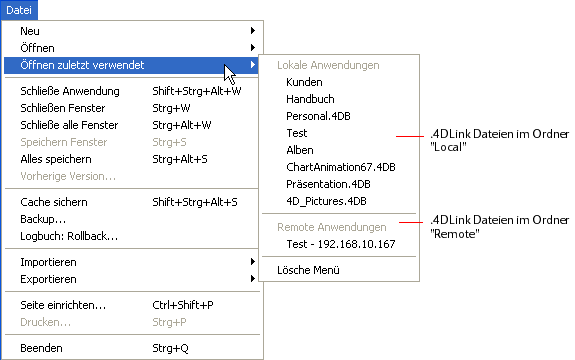 Über das Untermenü Zuletzt verwendet (Datei im lokalen Ordner Preferences). Eine Datei .4DLink vom Typ "remote Anwendung" können Sie kopieren und auf verschiedenen Rechnern verwenden.
