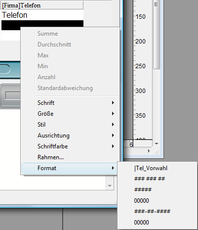 Das Untermenü zeigt die Formate, die dem Datentyp der Spalte entsprechen. Das ist in unserem Beispiel das Datenfeld „MengenPreis“, welches vom Typ Zahl ist. Enthält die Spalte nicht formatierbare Daten, erscheint der Befehl Format nicht im Kontextmenü..